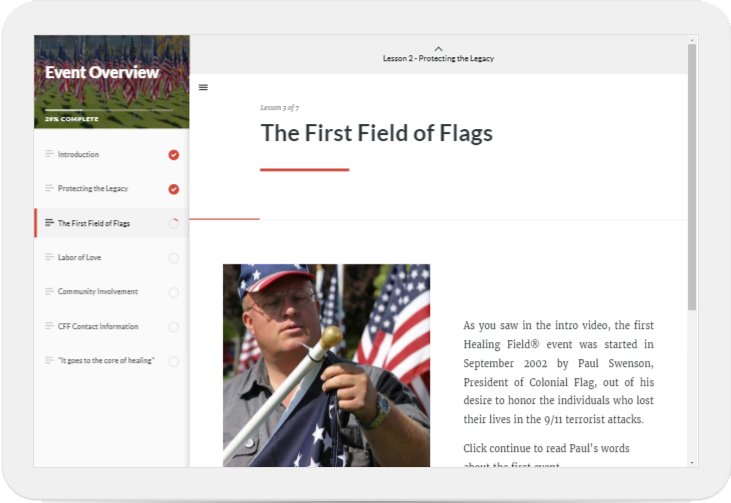 Transforming the training from compilations of documents into an online program integrated into their existing membership portal has been well-received by both the Colonial Flag Foundation staff and the volunteers they train.